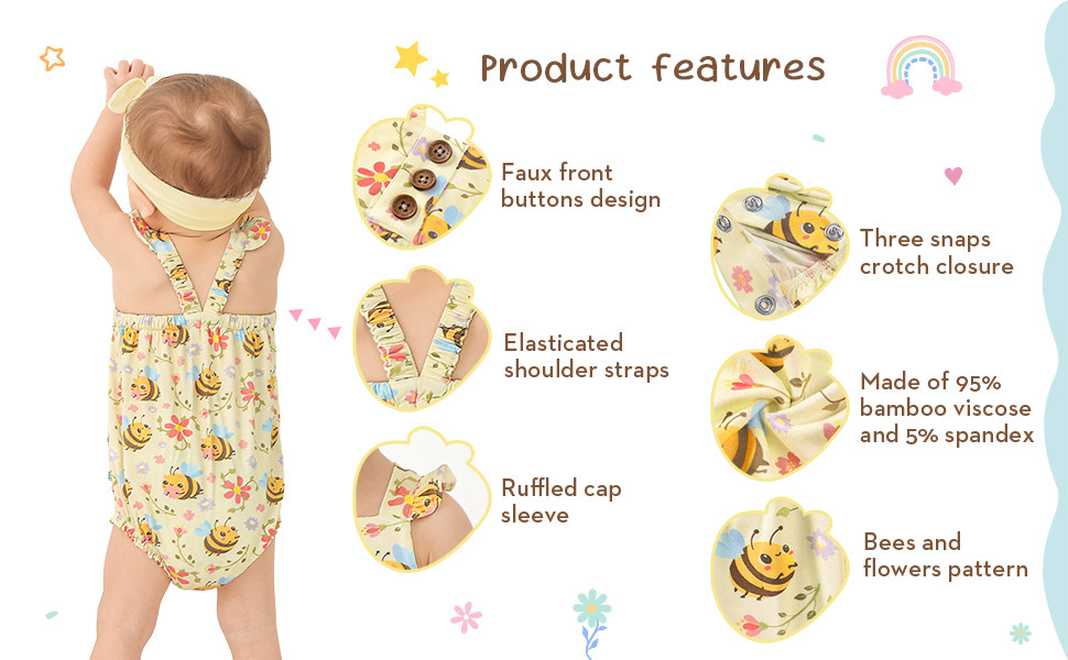 - Adorable and Stylish: The sweetly frilled cap sleeves, three decorative buttons on the front, and V-shaped elastic straps at the back create a stylish and adorable look. These exquisite details, along with the high-quality fabric, showcase the designer’s thoughtful craftsmanship and attention to detail.