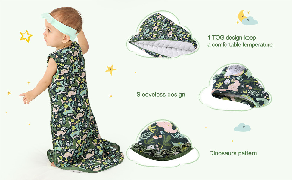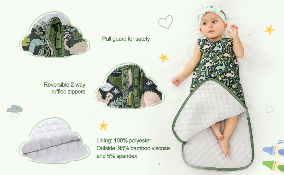 - REVERSIBLE 2-WAY RUFFLED ZIPPERS – Whether you’re just checking on your baby or want to change their diaper in the middle of the night, the double zipper makes it easy to get in and out quickly without waking them up, while ruffled around the zipper makes your little one extra cute. The pull guard at the top of sleep bag prevents scratching your baby’s delicate skin.