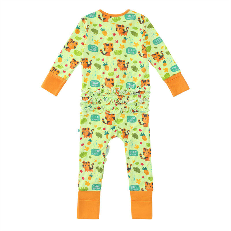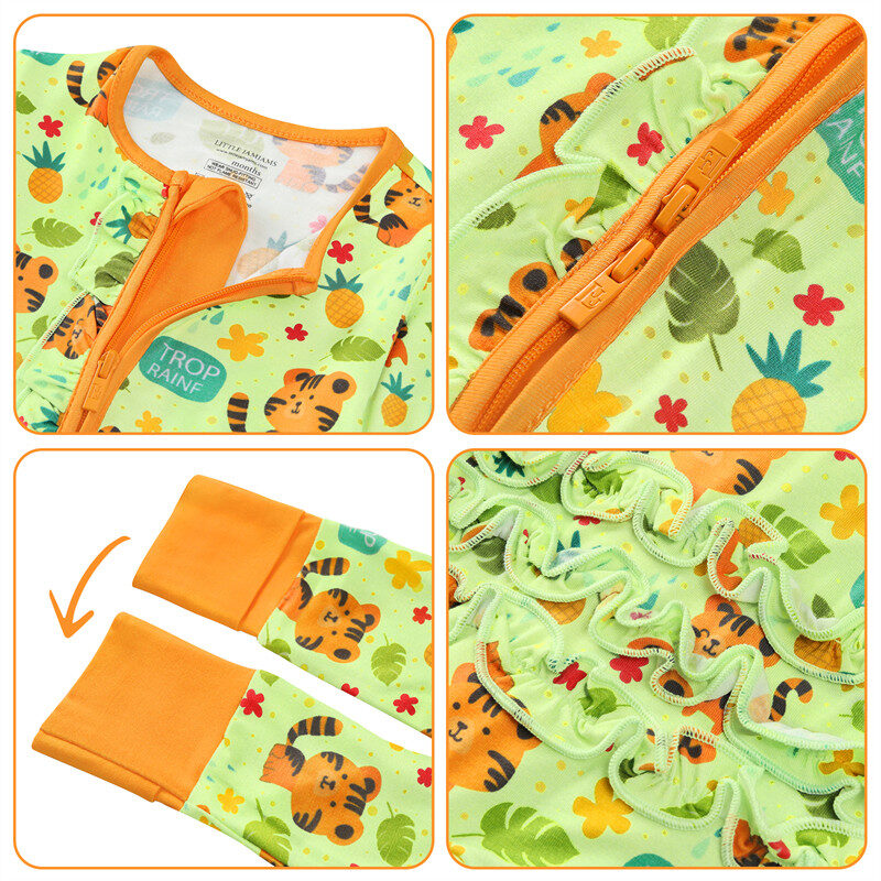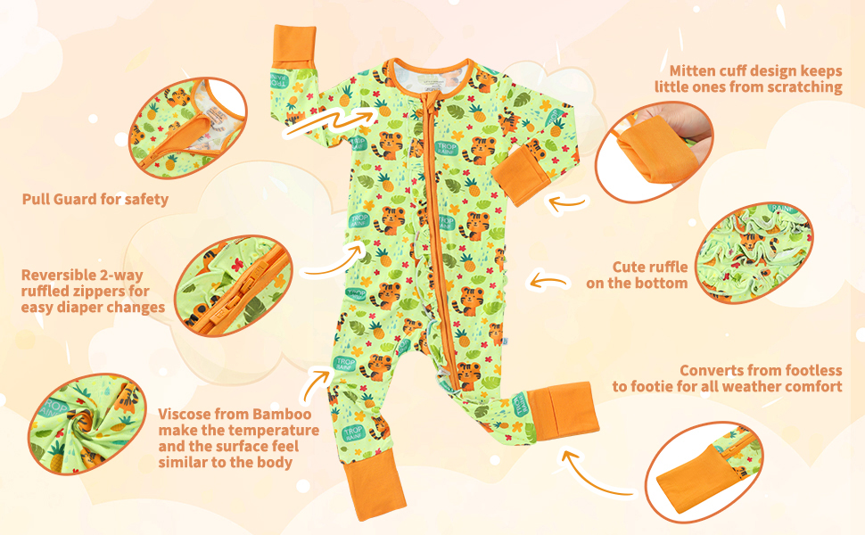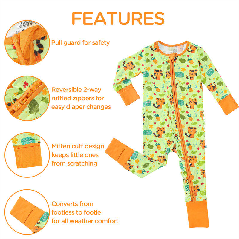 - Reversible 2-way ruffled zippers for easy dressing and diaper changes – Get ready to make changing a breeze! Our convenient two-way ruffled zippers allow for quick and easy changes; simply unzip from top to bottom or bottom to top. Our soft viscose of bamboo onesie is designed with an added layer of protection to prevent the zipper from scratching or irritating delicate skin. Stretch ruffles around the back waist for added charm.
