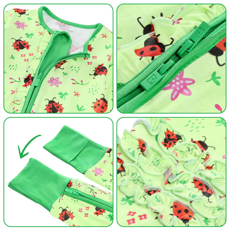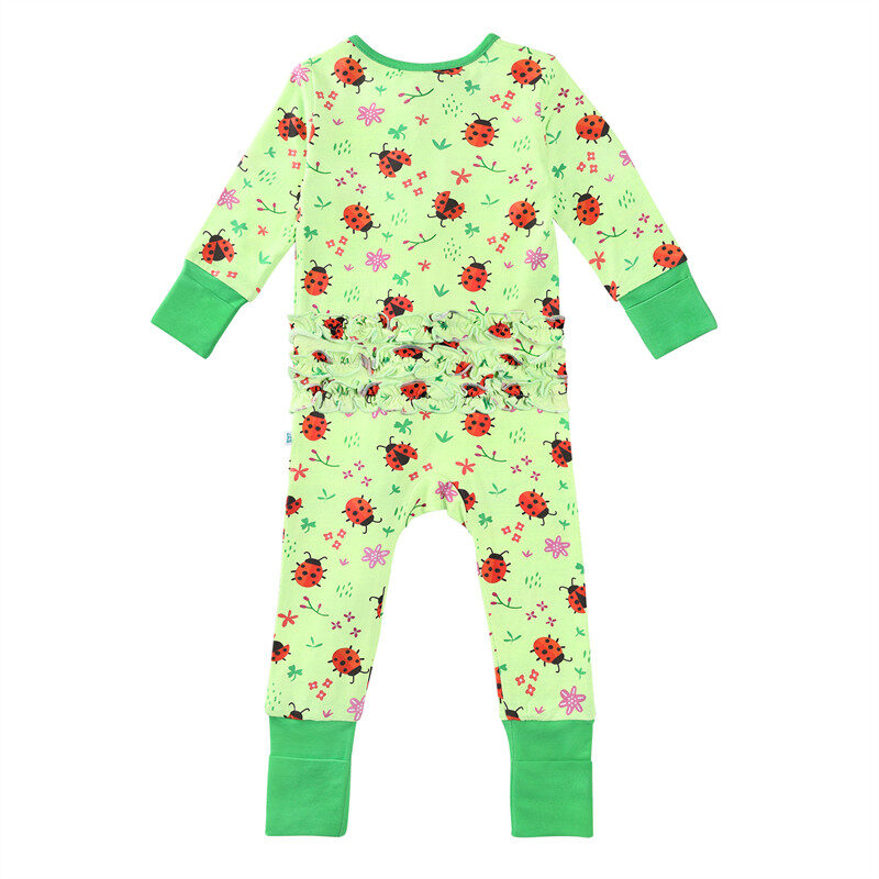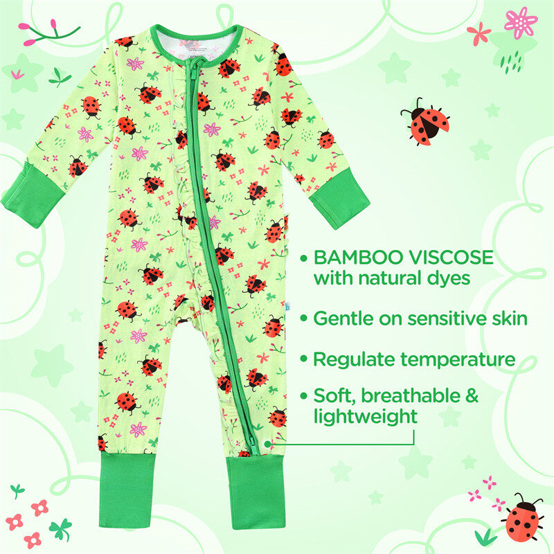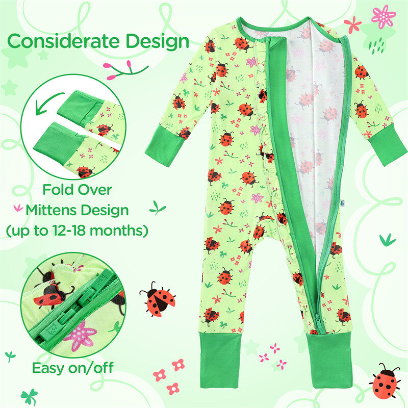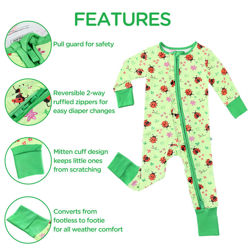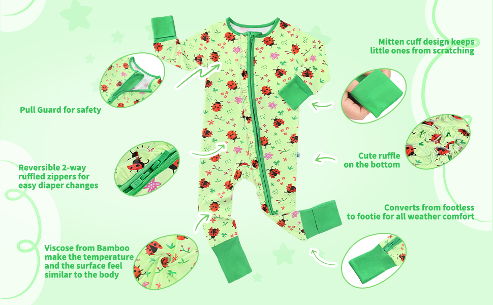 - Reversible 2-way ruffled zippers for easy dressing and diaper changes – Get ready to make changing a breeze! Our convenient two-way ruffled zippers allow for quick and easy changes; simply unzip from top to bottom or bottom to top. Our soft viscose of bamboo onesie is designed with an added layer of protection to prevent the zipper from scratching or irritating delicate skin. Stretch ruffles around the back waist for added charm.