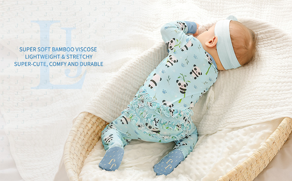 - LIGHTWEIGHT, SOFT & STRETCHY – Made of 95% bamboo viscose and 5% spandex to provide a stretchy, comfortable fit. Footed versions feature non-slip grips for new walkers! Stretch ruffled around the back waist for added lovely.